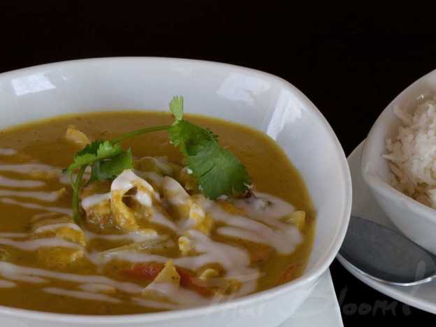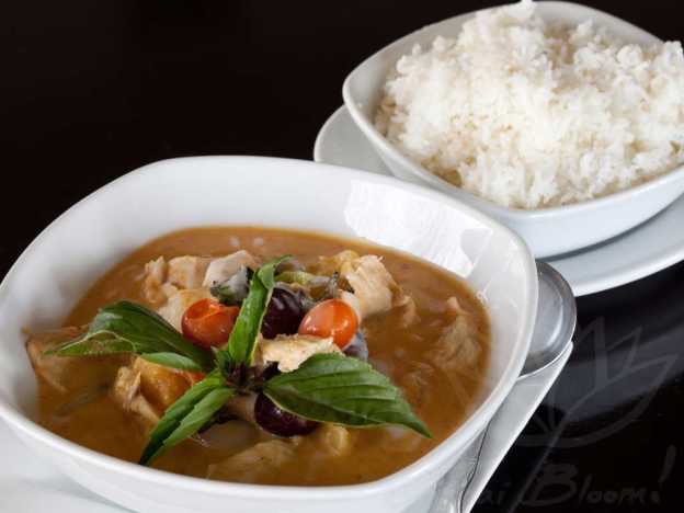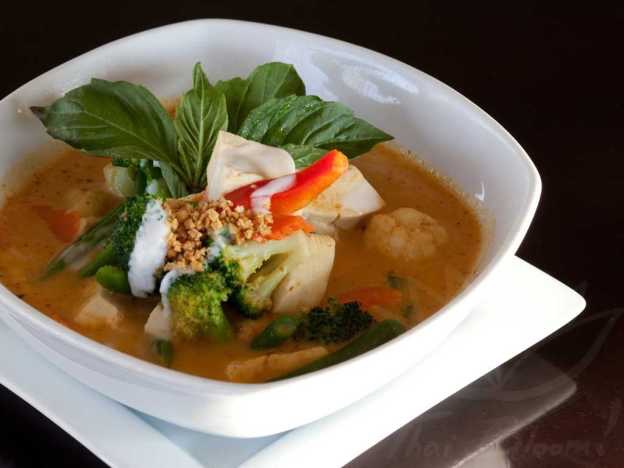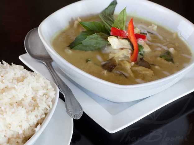 Classic coconut milk based green curry with young coconut meat, eggplant, bell pepper, bamboo shoot, green bean, and fresh basil.