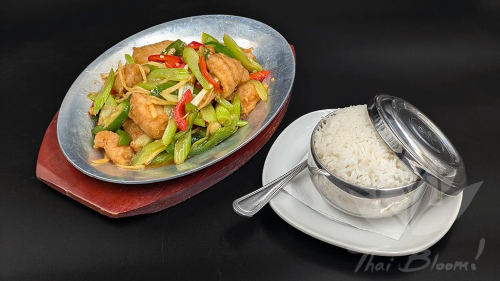 Lightly battered Swai fillet (a freshwater fish native to Thailand and the Mekong River Basin), stir-fried with fresh ginger, garlic, celery, bell peppers, green onion, and jalapeño in a savory house soy sauce. Finished with a touch of sesame oil for a fragrant, well-balanced dish.