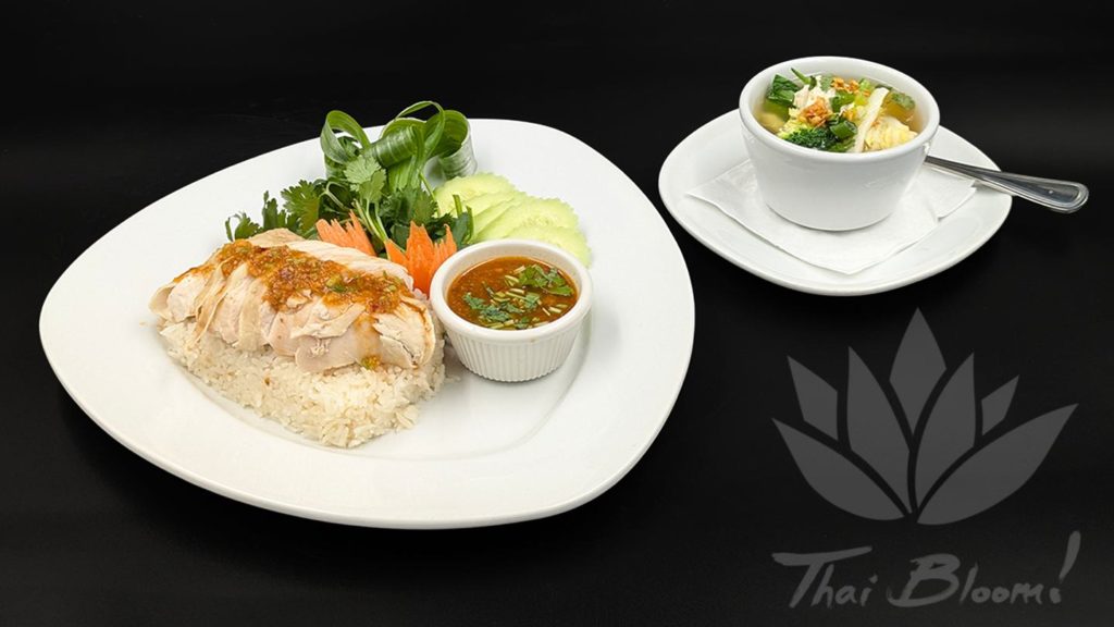 Steamed chicken sliced and served atop steamed rice cooked in chicken broth, garlic and ginger. Paired with tofu and veggie soup and soy bean paste, garnished beautifully with cucumber, cilantro, and green onion.